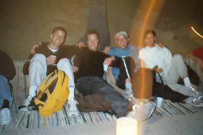 | Okidoki, nach diesem bildlichem Intermezzo kommen wir wieder zur Sache. Der letzte Teil des Rittes ging zu einem Beduinenlager, so stand es jedenfalls im Ausflugsführer, wo wir dann ein Beduinennachtessen unter Sternenhimmel geniessen können. Das mit dem Sternenhimmel stimmte. Ein Beduinenlager würde das niemand nennen, der sah, was wir sahen. Das war ein richtiger Pfadi Massenrastplatz, ziemlich improvisiert. Und die Verkaufsmöglichkeiten die sich da boten, glichen eher der Bahnhofsunterführung in Brugg als einem Beduinenlager. Das Essen war zu 50% möglicherweise beduinisch: Fladenbrot, Sesamsosse, Ziegenfleisch, gebratenes Hähnchen (laufen die Viecher auch in der Wüste rum?), Kartoffeln mit Tomaten (irgendwo sind sicher die Plantagen versteckt). Zu trinken gab es Habaktee und Cola (kein Kommentar). Aber etwas muss man zugeben, das Essen war wirklich sehr fein, einfach mit einem westlichen Touch. | ||||||||||||