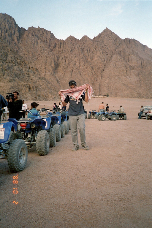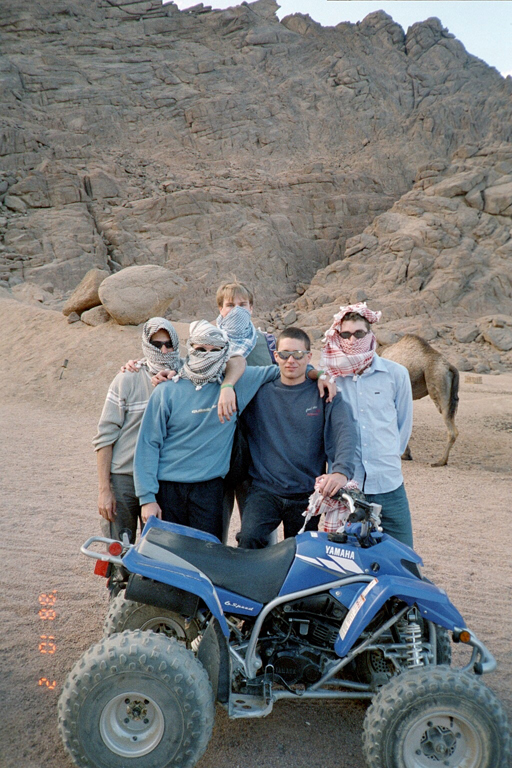| Toefffahren in der Wüste war für einige der Knüller. Etwas Krach in die ruhige Gegend zu bringen, yipiee! Diesen Spass wollten sich die folgenden Herren nicht entgehen lassen: Daniel Begel, Markus Ernst, Mathias Frei, Stefan Boesch und Simon Amrein. Das einzig nötige Utensil war ein Tuch, welches sie im Basar gekauft haben, damit ihnen der Sand nicht ständig ins Gesicht wirbelte. Einige Bilder dieser Raserei seht ihr unten. | ||||||||||